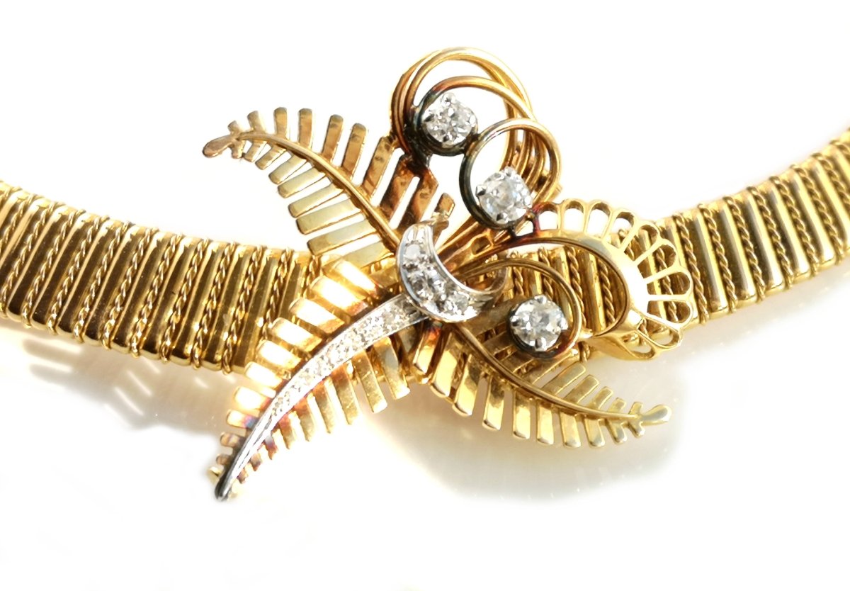 A stunning piece of French retro transformation jewellery. Made in 18k gold, it comes with a detachable brooch, set with old cut and 8/8 cut diamonds.