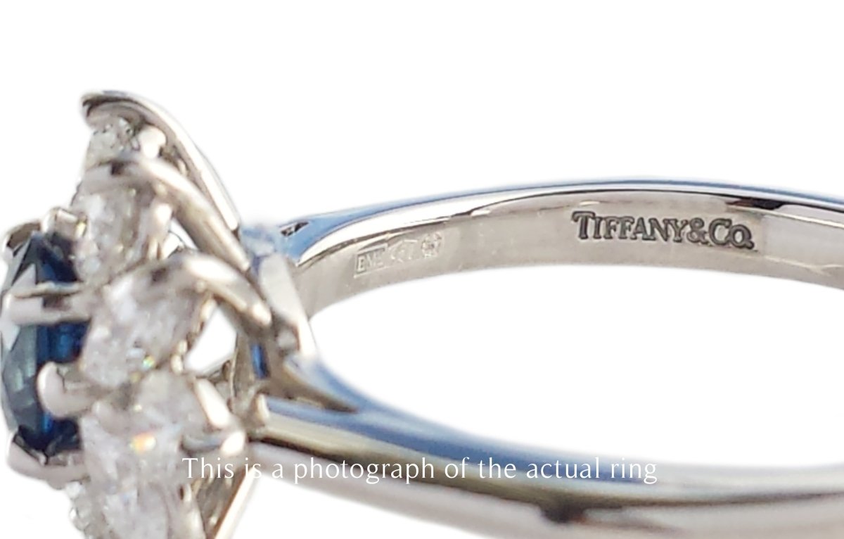 A wonderful vintage cluster ring by Tiffany & Co, set with six round brilliant natural white diamonds and four pear shaped diamonds with a total approx carat weight of 0.70ct (E-F, VS) surrounding a central 0.60ct natural Madagascan sapphire . The ring is in beautiful unworn, original condition; the band is fashioned in platinum and shows no wear at all. This ring would make a very pretty and unusual engagement ring or as a right hand ring. It is a rare piece, no longer produced by Tiffany & Co.