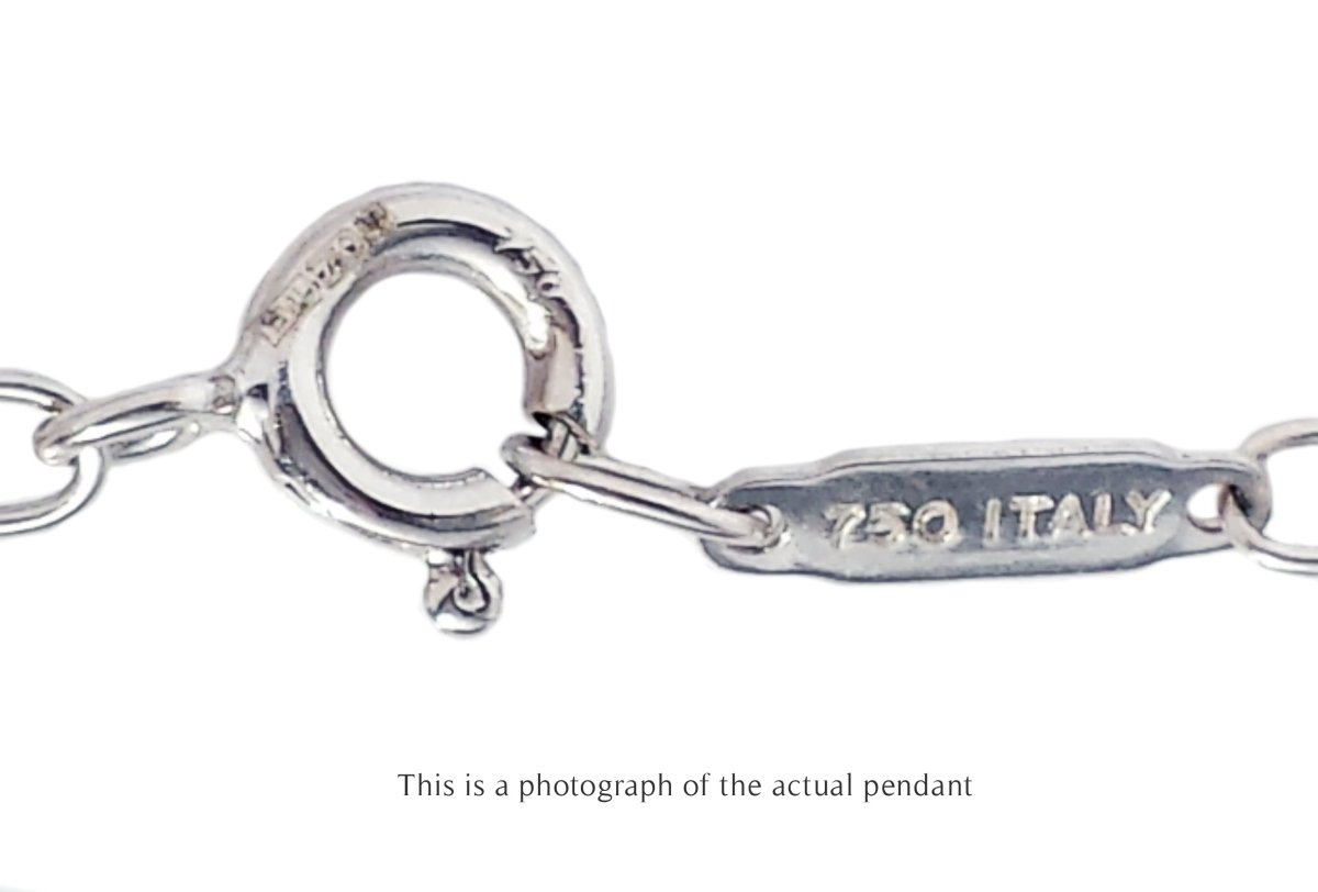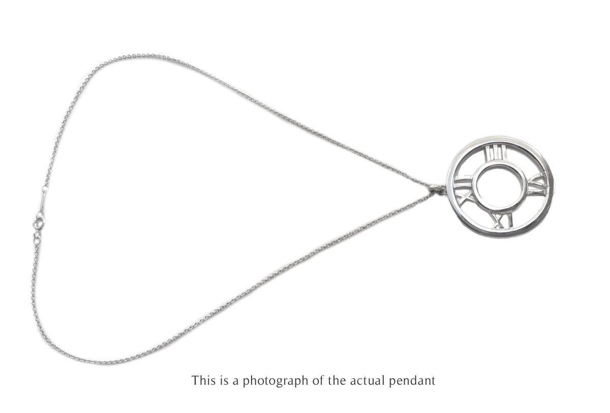 This is the large version of the Tiffany & Co. Atlas Roman numerals pendant. A very stylish pendant, crafted in 18k white gold and no longer retailed by Tiffany & Co. The pendant is suspended on a 16 inch Tiffany & Co. white gold chain.