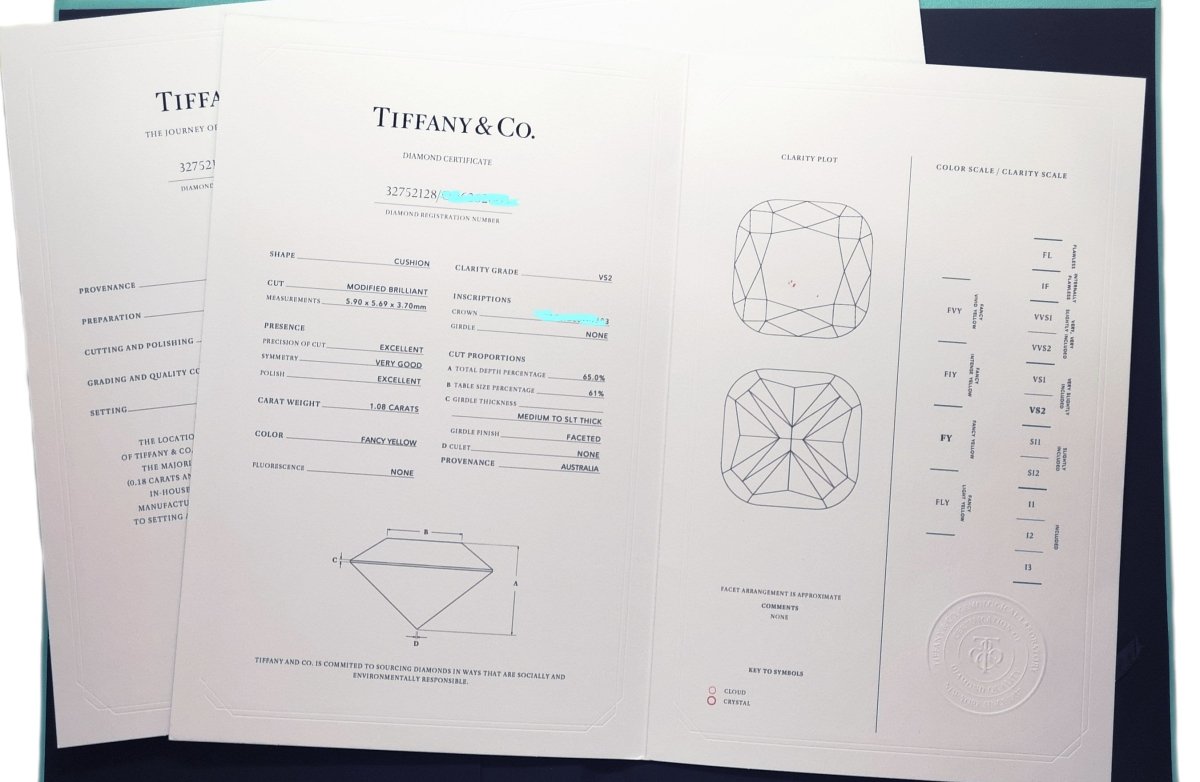 The cushion cut Tiffany Diamond is a mesmerising yellow; it has been certified by Tiffany & Co. as an FY (Fancy Yellow) in colour, VS2 clarity, and is of course laser engraved with the Tiffany Diamond Registration Number.