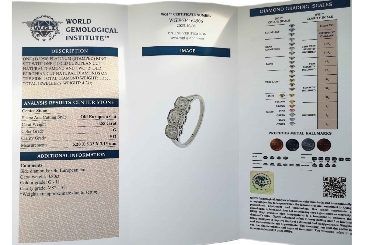 The diamonds are assessed as; one 0.55ct old cut diamond in the middle and a further 0.8tcw between the other two stones. Colour and clarity have been assessed in the setting as G/H (VS2-SI2).