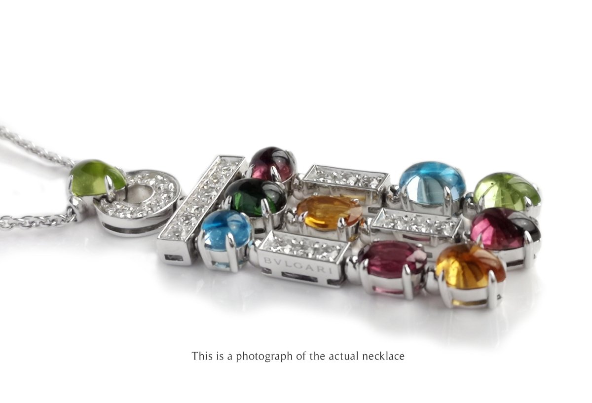 A stunning Allegra necklace by the kings of gems, Bulgari, based in Rome. Impeccable craftsmanship underscores every Bulgari jewel. This necklace is finely crafted in 18k white gold and set with pink tourmalines, vivid green peridots, sky blue topaz and sun yellow citrines as well as brilliant white natural diamonds.