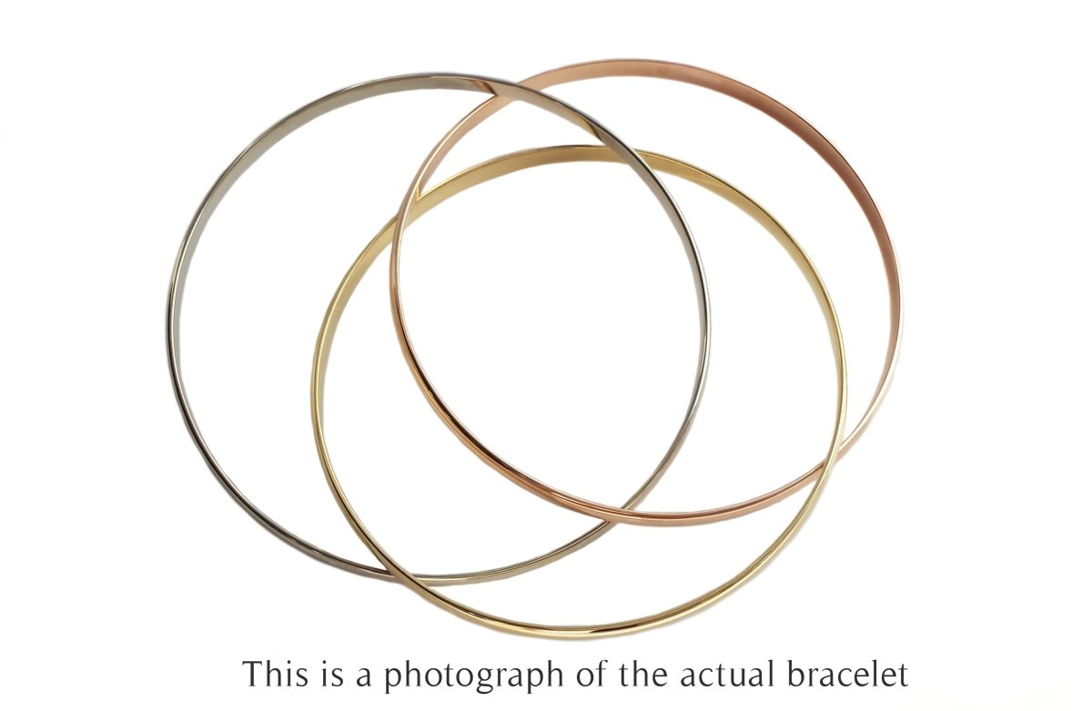 Each bangle is carefully crafted from 18k gold; one in white, one in rose and one in yellow gold.