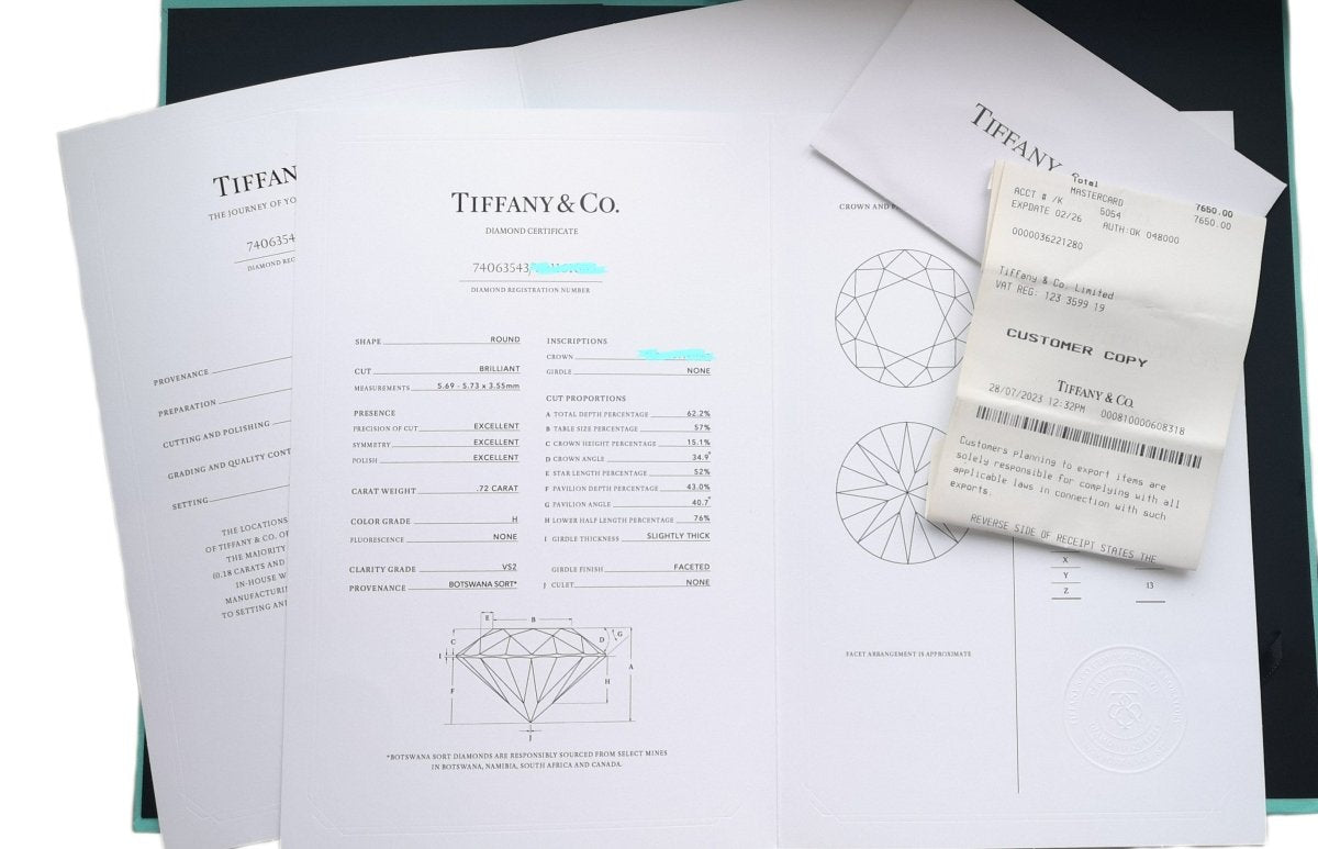 Inside the band, the ring is stamped ©Tiffany & Co. PT950 D.72ct and with a unique serial number. The diamond itself is laser-inscribed with its own Tiffany & Co. Diamond registration number, as confirmed by the Tiffany & Co. diamond certificate. The original purchase receipt is also included.