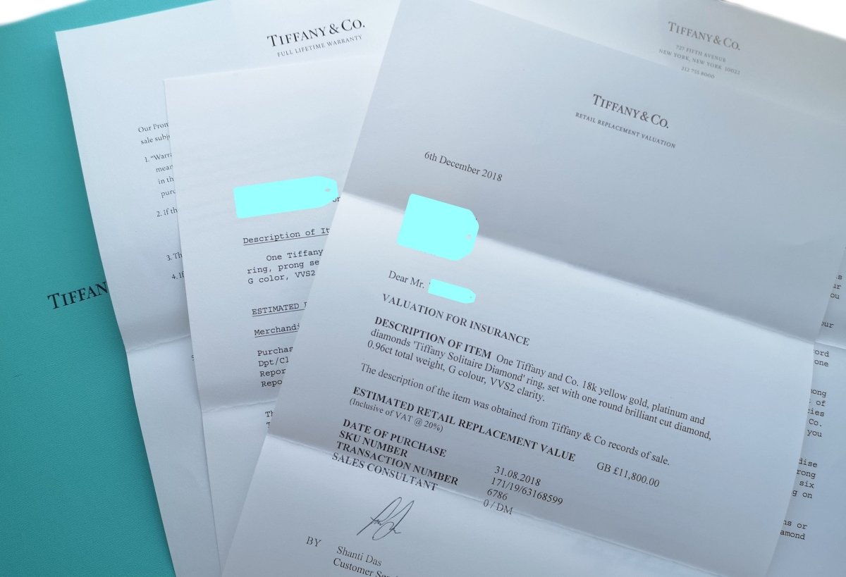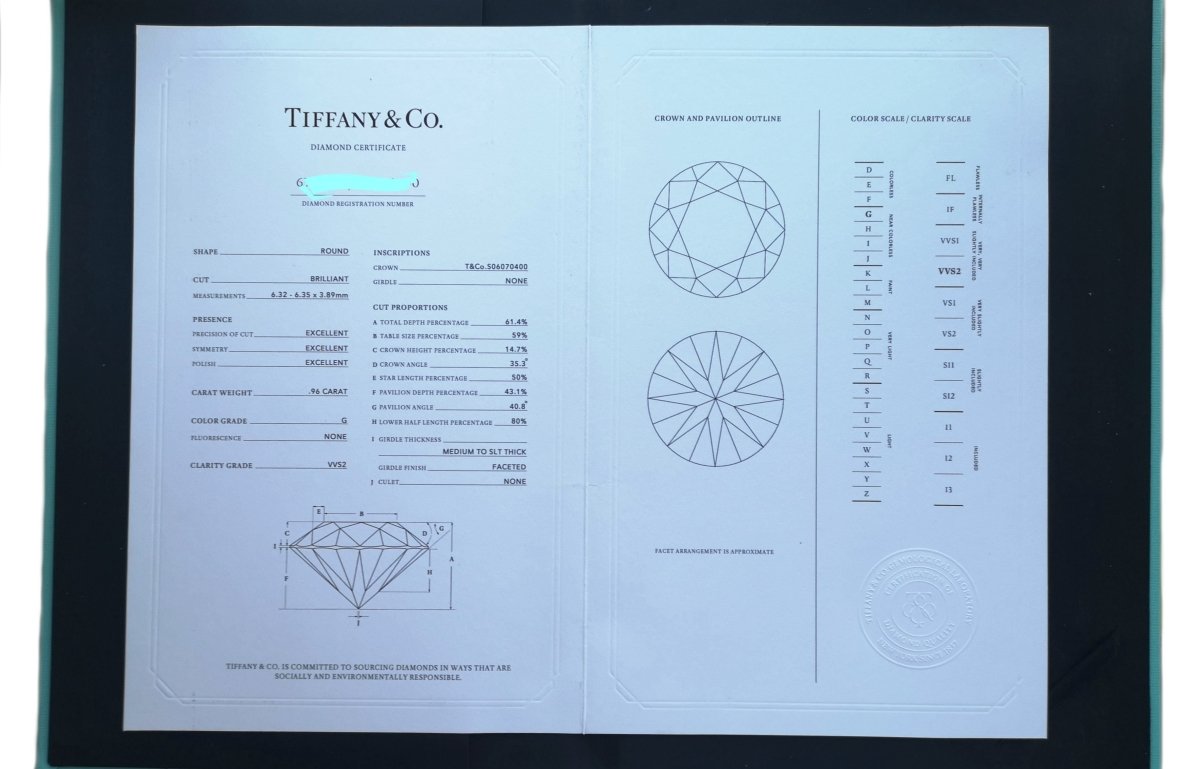 Inside the band, the ring is stamped ©Tiffany & Co. AU 750 PT950 D0.96ct and with a unique serial number and UK Hallmarks for 18k Gold & Platinum. The diamond itself is laser-inscribed with its own Tiffany & Co. Diamond registration number, as confirmed by the accompanying Tiffany & Co. diamond certificate.
