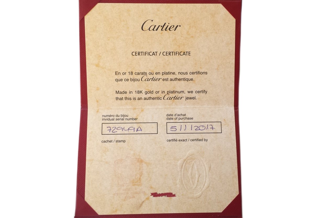 Signed Cartier, 51, with unique serial number. The ring carries additional hallmarks for 18k white gold.
