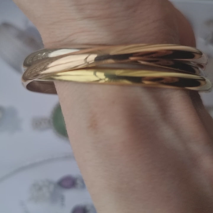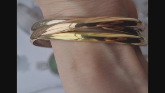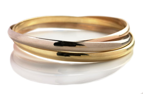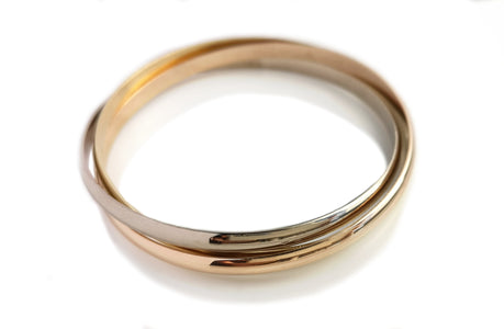 Each bangle is carefully crafted from 18k gold; one in white, one in rose and one in yellow gold.