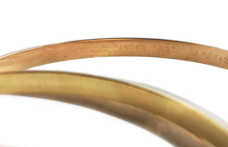 Inside the bangle, it is signed Cartier 750 MD ©CARTIER 1997 750 and with a unique serial number. The outside edge is stamped with French Eagle's head Hallmarks and it has additional UK hallmarks for 18k Gold.