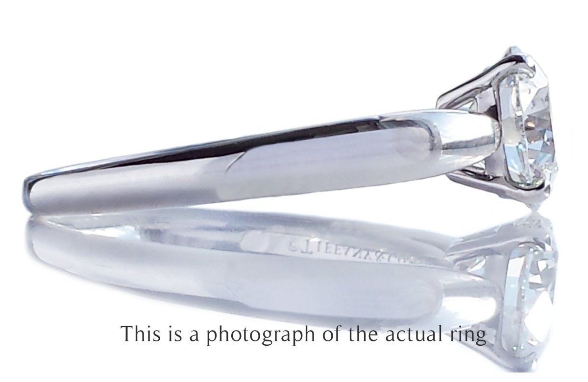 Inside the band, the ring is stamped (c)Tiffany & Co. PT 950 D1.51CT with a unique serial number corresponding with the Diamond Certificate. Additional UK hallmarks applied.