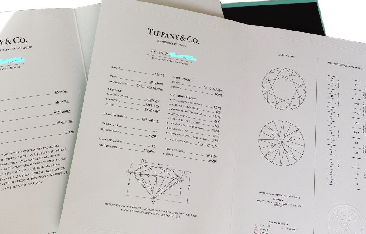 This ring possesses a diamond weighing 1.51ct and H/VS2 colour and clarity. It is laser inscribed with Tiffany & Co. identifying number, as detailed on the certificate.