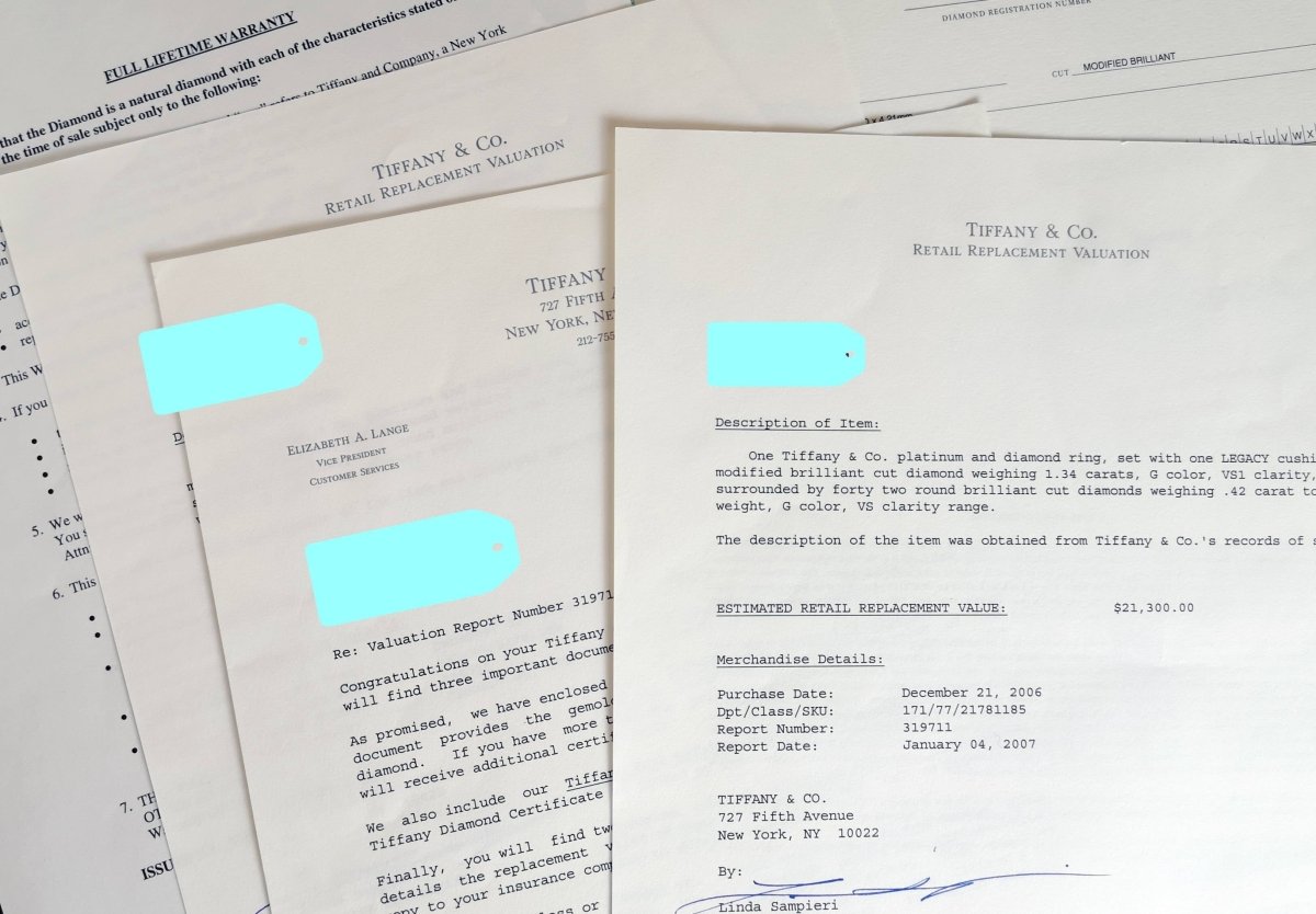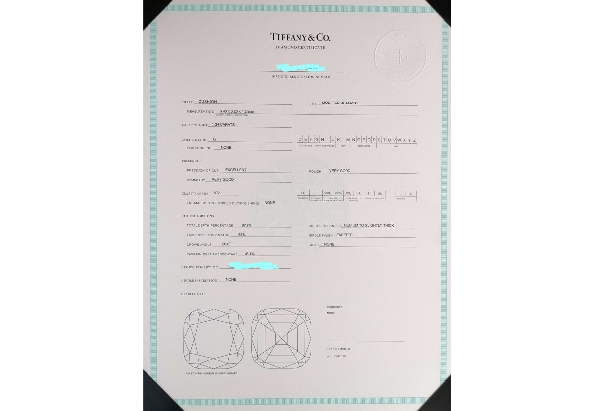 Inside the band, the ring is stamped ©Tiffany & Co. PT 950 Pat D 467 833 et al 1.34CT and with unique serial number 217*****. The diamond is laser inscribed with a unique diamond registration number.