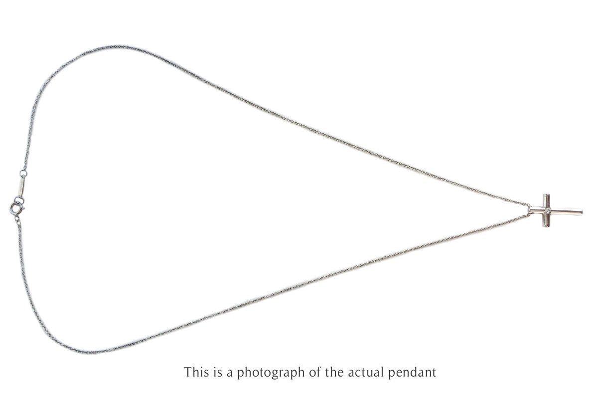A simple and elegant Cross Pendant by Tiffany & Co. Set with a single white natural Tiffany diamond, this rare piece is fashioned in 18k white gold. It features an integral 16 inch Tiffany & Co. chain, also in 18k white gold.