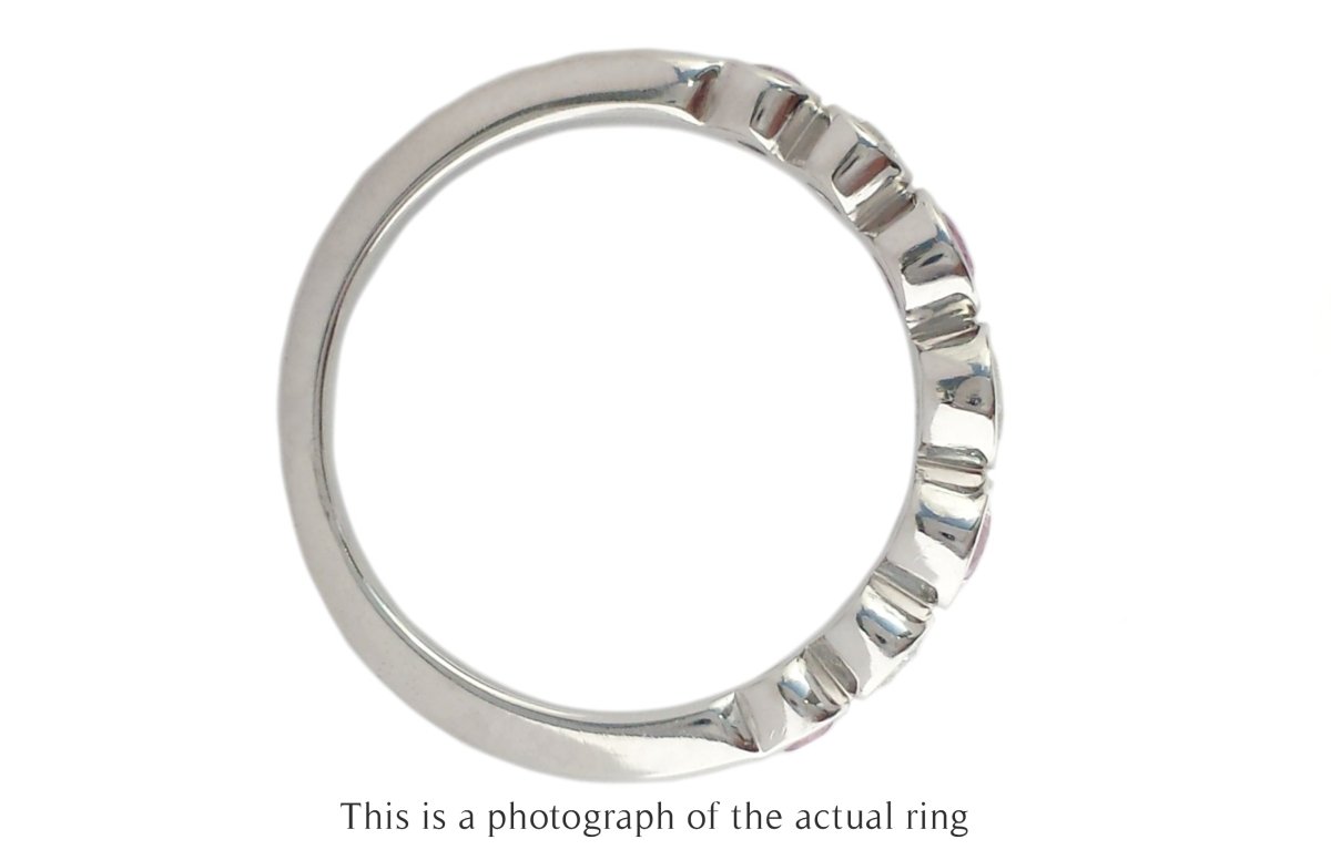 This exquisite Tiffany & Co. ‘Jazz’ graduated band ring from the current Bloomsbury Manor collection features seven round-cut stones: four vivid pink sapphires (total estimated 0.40ct) and three round brilliant-cut diamonds (total estimated 0.20ct, G-H colour, VVS-VS clarity).