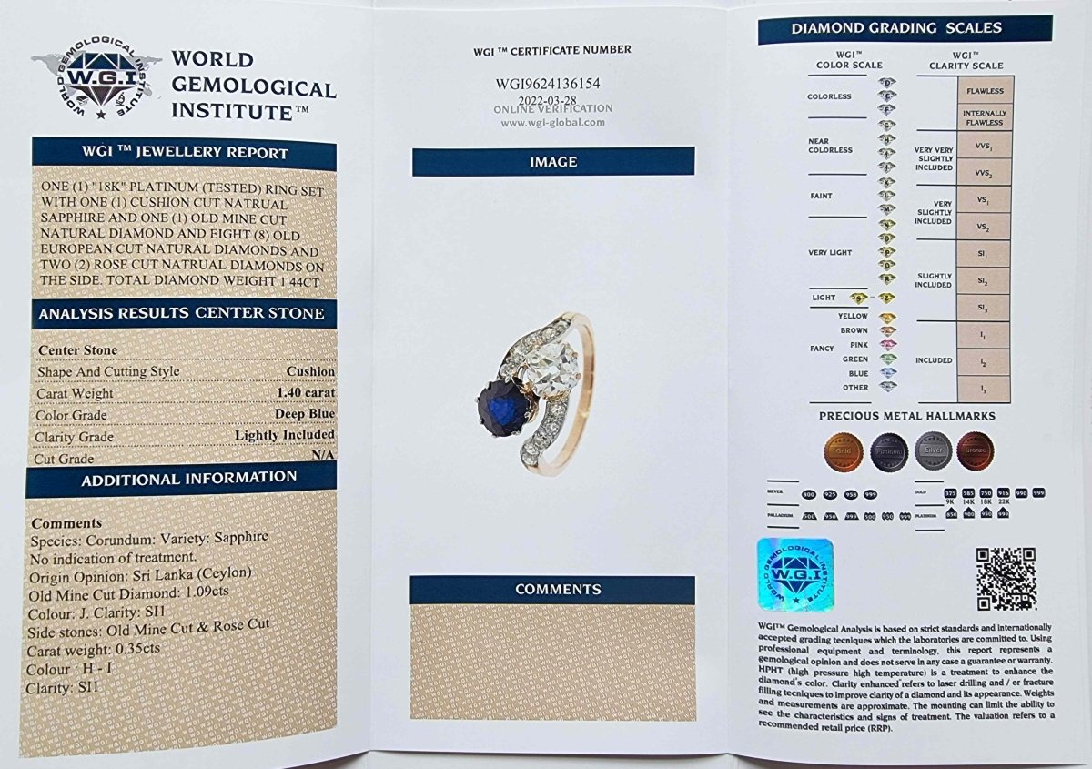 Set with a Ceylon natural Deep Blue Sapphire with no evidence of heat treatment, weighing 1.40ct and a sparkling very clear and white 1.09ct J/SI1 cushion cut diamond.