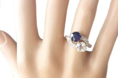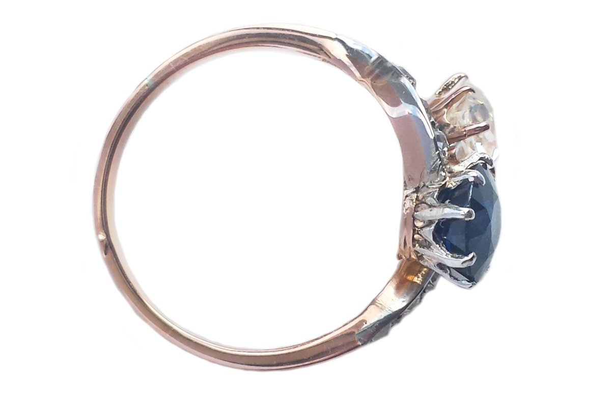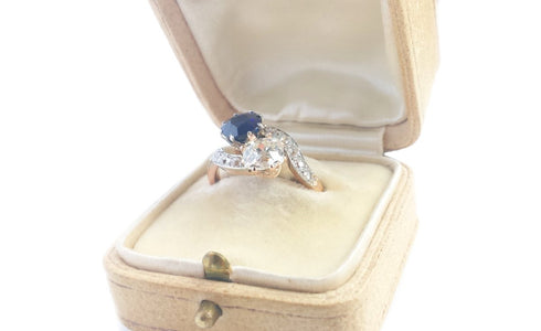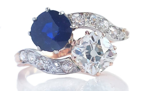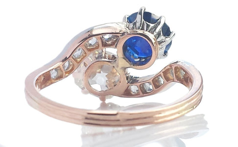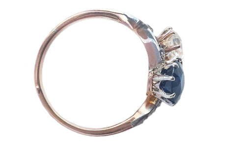 Edwardian Toi et Moi Crossover Old Cushion Cut Diamond & Sapphire 18k Ring