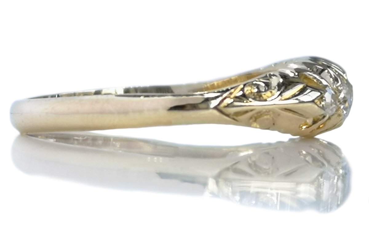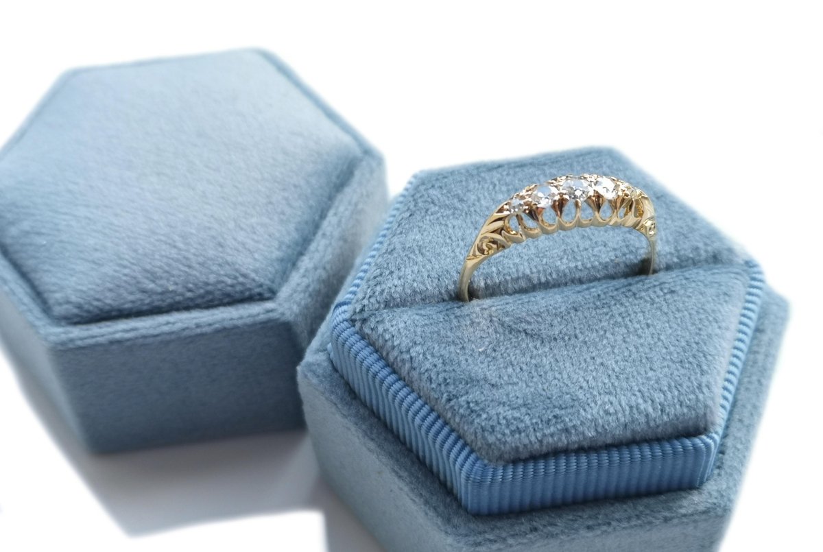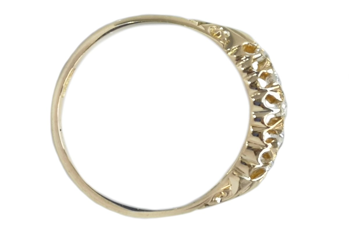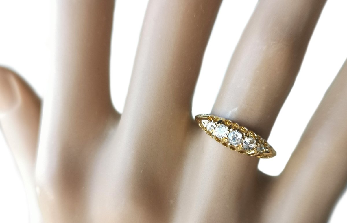 A wonderful example of a late Victorian engagement ring featuring 5 very pretty old cut diamonds with no visible inclusions. The diamonds measure 2.85mm (2.69mm x 2) (1.53mm x 2). The total carat weight is approximately .30tcw.