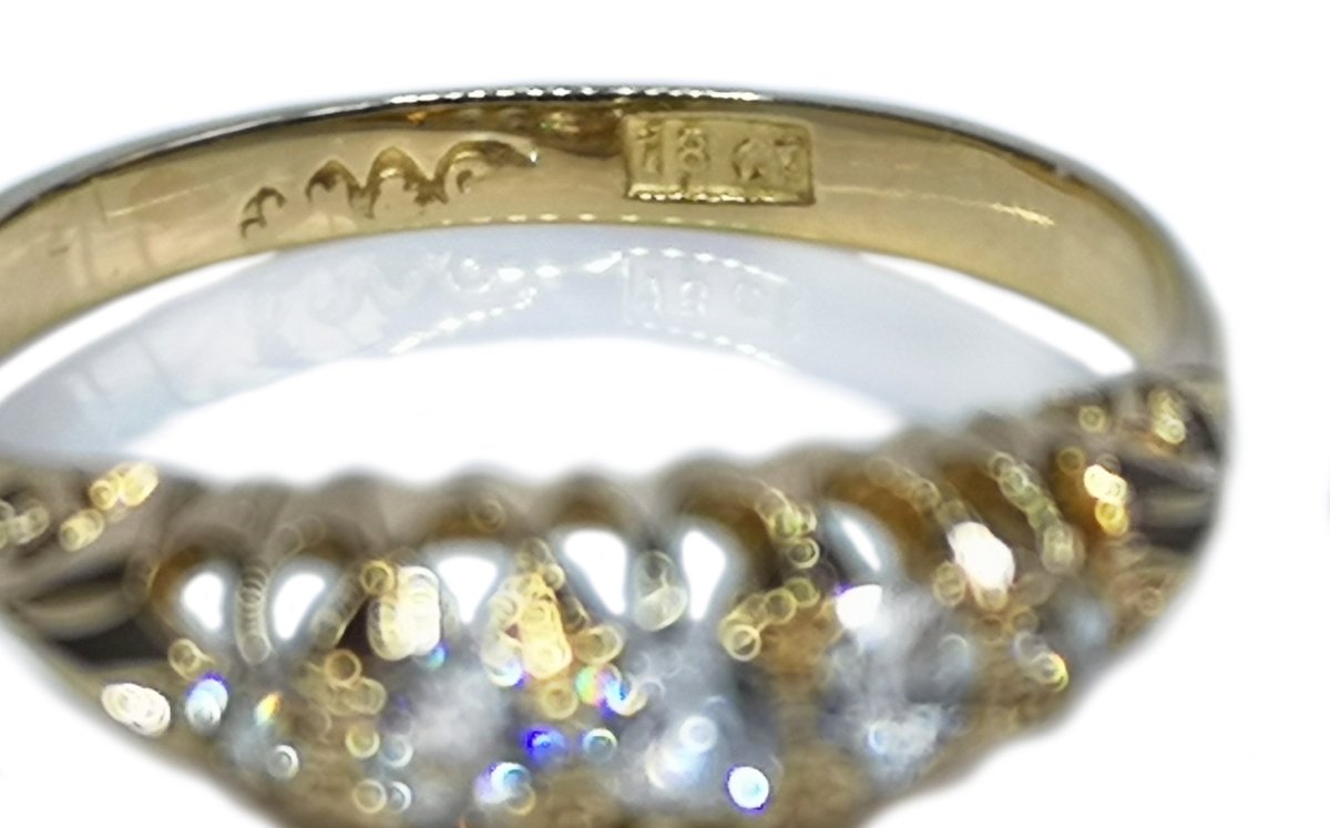 The ring is stamped 18ct and tests as 18k gold. A makers mark is present (indistinct).