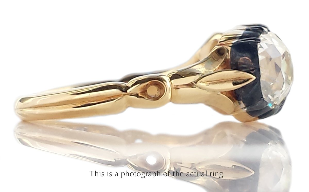 As with nearly all cut down settings, this ring has been expertly hand crafted in 18k gold and silver. The shoulders feature a delicately carved trefoil detail, and the band is stamped 18ct SILVER (slightly worn).
