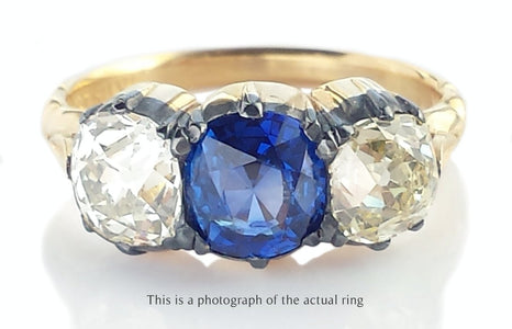 An incredible find! An original antique Victorian Engagement Ring featuring two old mine cut diamonds, weighing 1.03ct and 1.05ct, with a colour and clarity of J-K/VS1/VS2, accompanied by a 1.44ct natural cushion cut sapphire with a perfectly saturated royal or cornflower blue hue.