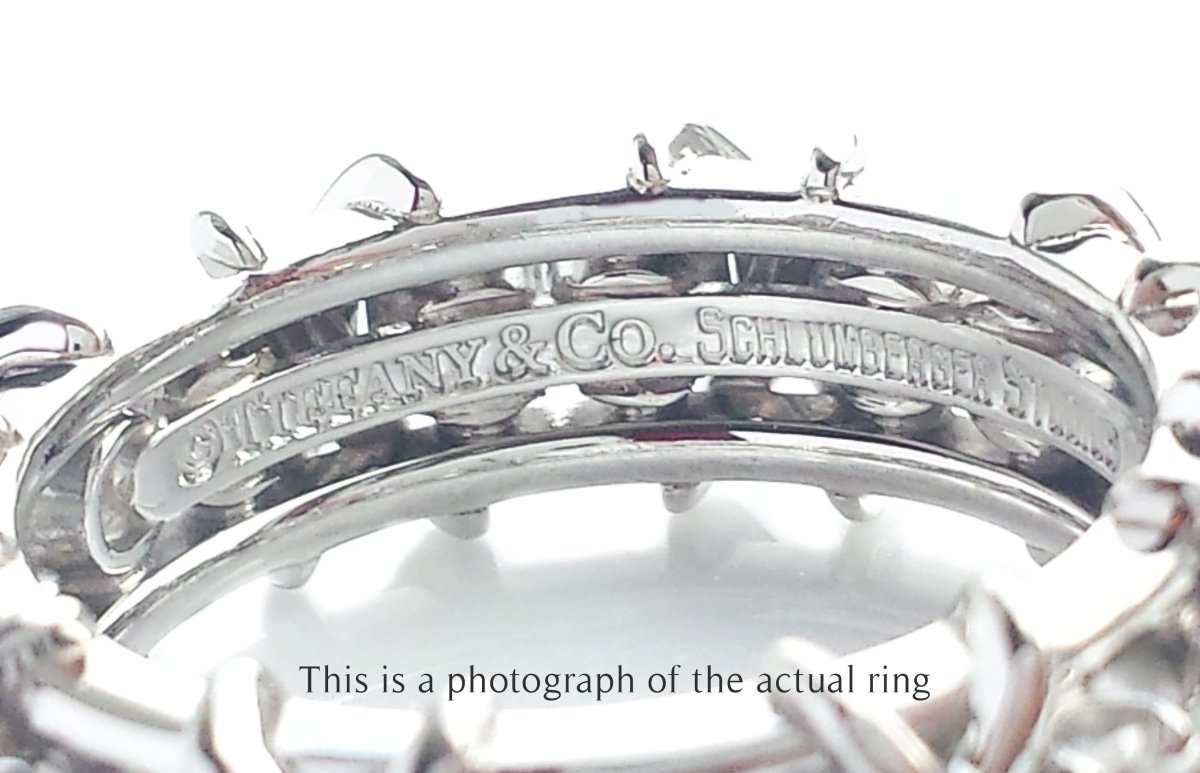 Inside the band, the ring is stamped ©Tiffany & Co. Schlumberger PT950. With additional UK hallmarks for platinum. The ring is a size L (UK), 5.75 (US); please note that this ring is not re-sizable.